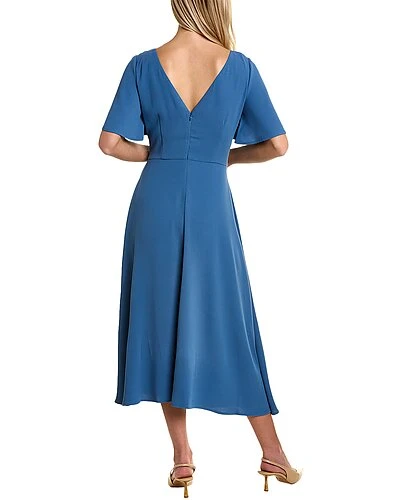 - Boatneck Flutter Sleeve A-Line Dress in denim blue with left slit at hem