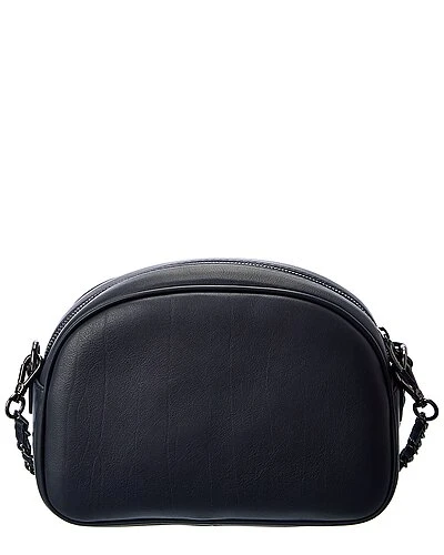- Harper Leather Crossbody in midnight blue leather and gunmetal-tone hardware with stitched logo and tassel accent