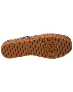 - Brocade Canvas & Leather Espadrille in blue and white canvas with leather trim and jute platform