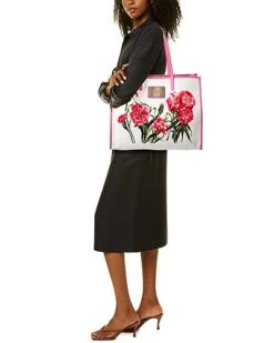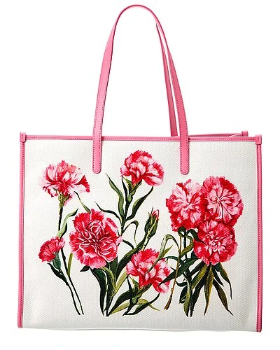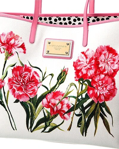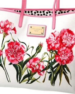 - Floral Print Canvas & Leather Shopper Tote in white printed canvas and pink leather and silver-tone and gold-tone hardware with logo plaque