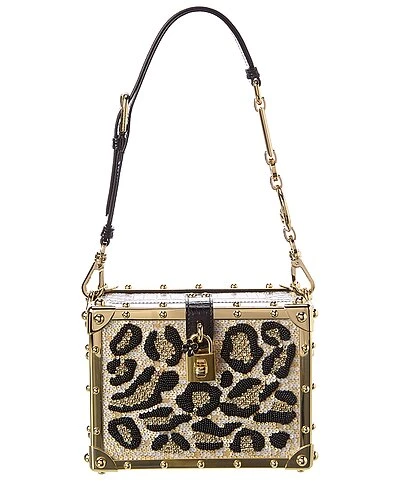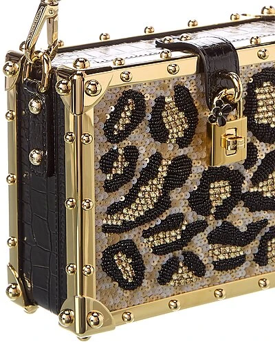 - Satin & Leather Box Bag in black satin and croc-embossed leather and gold-tone hardware with sequin embellishments