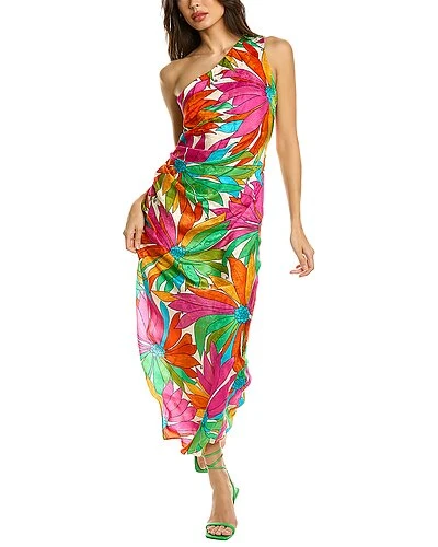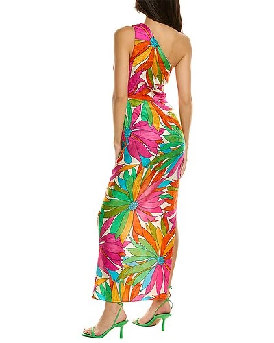 - Gildo Silk-Blend Maxi Dress in jacquard jungle floral with one-shoulder neckline, pleated detailing and split hem