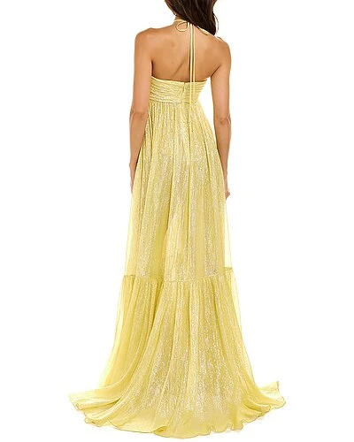 - Design details: metallic chiffon fabric, self-tie halter neck and shirring details