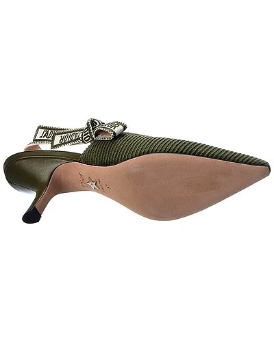 - J’Adior Canvas & Leather Slingback Pump in khaki textured canvas and leather with logo printed elasticized slingback strap with bow accent
