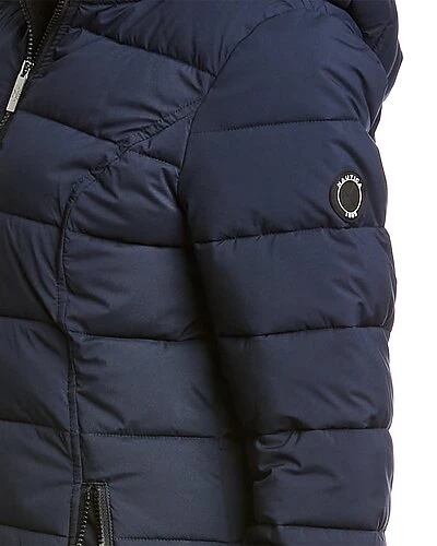 - Design details: quilted puffer style, stand-up collar, removable hood, dual front zipper pockets, and zippered side vents