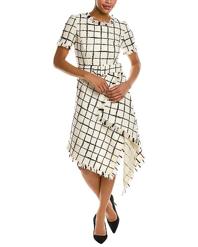 - Window Pane Tweed Silk-Lined Wool-Blend A-Line Dress in cream/black with metallic tweed construction, fringe trim, belted waist, layered drape skirt front, dual front pockets and asymmetrical hem