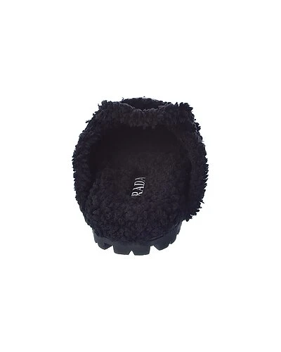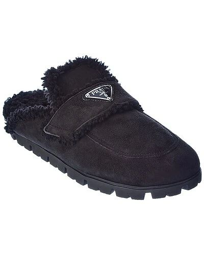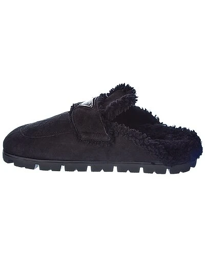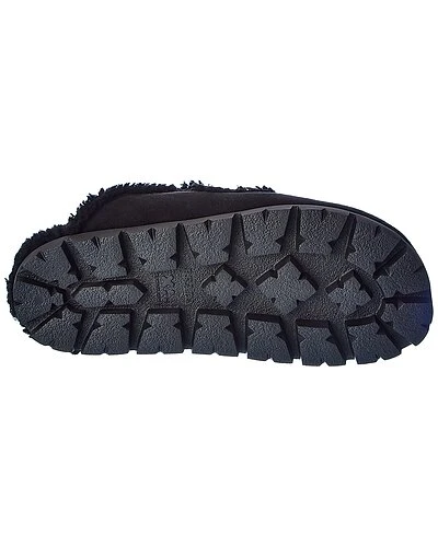 - Logo Suede & Shearling Slipper in black suede and steel finish hardware with logo accent and shearling trim