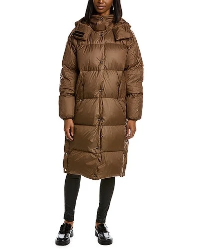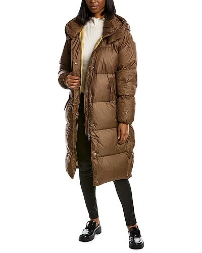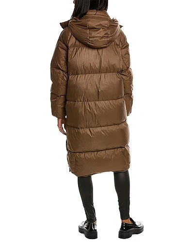 - Joelle Puffer Down Coat in brown with pillow collar, hood back, raglan sleeves, two front pockets, and snap vents at sides