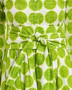 - Aster Shirtdress in fuzzy dot lime green with 3/4-length sleeves, pleated skirt, side seam pockets, matching belt, and tie sash at waist