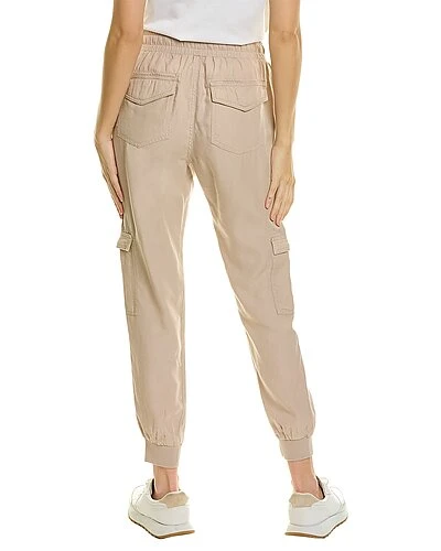 - Odessa Linen-Blend Jogger in latte with elasticized waistband, four pocket styling, two cargo pockets, and rib cuffs