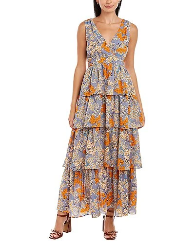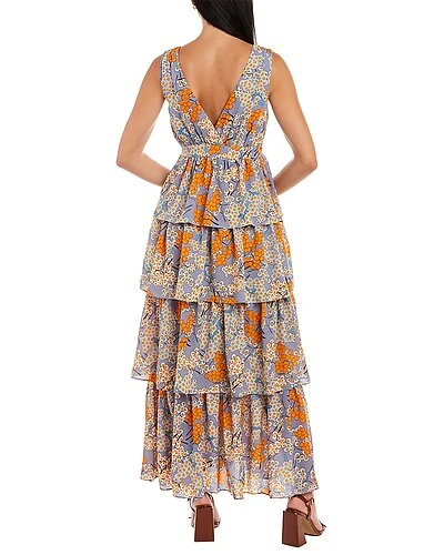 - Design details: surplice bodice and tiered ruffle skirt