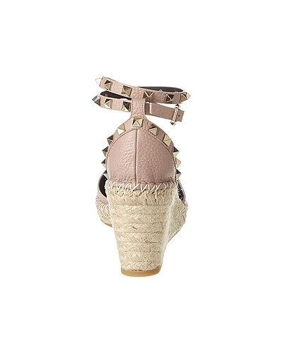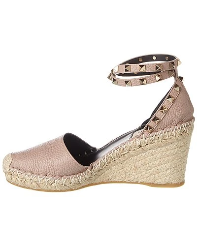 - Rockstud 85 Grainy Leather Wedge Sandal in powder grainy leather with platinum-finish pyramid stud details and jute base