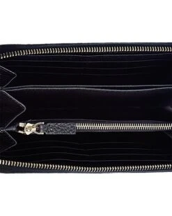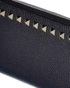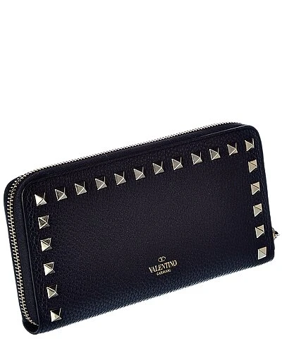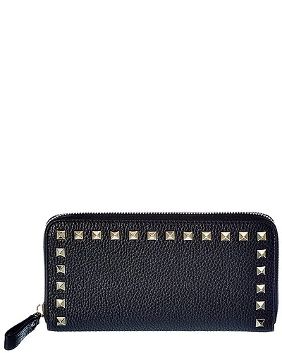 - Leather Continental Wallet in black grainy leather with platinum-finish rockstuds