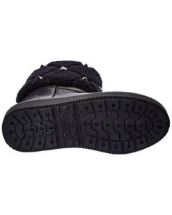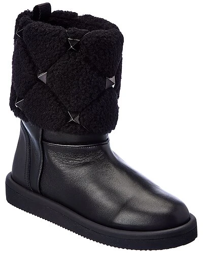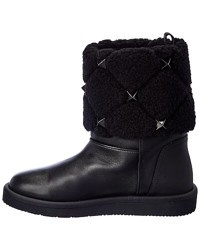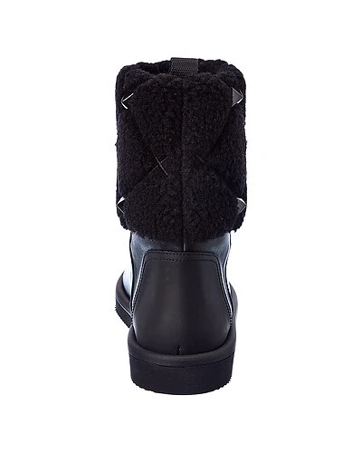 - Roman Stud Leather & Shearling Boot in black leather and shearling and gunmetal-tone hardware with Roman studs