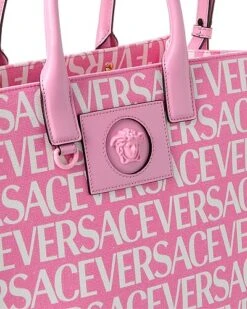 - Logo Canvas & Leather Tote in pink canvas and leather and gold-tone hardware with Medusa head logo accent